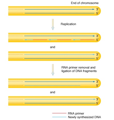Telomer bryts lÄngsamt ned under mÄnga celldelningscykler, vilket ger en skyddande buffert för de interna kromosomomrÄden som bÀr generna. Den gradvisa förlusten av telomerer kan förklara varför celler bara kan dela sig ett visst antal gÄnger.