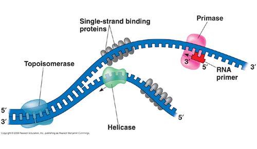 Topoisomeras: relaxerar supercoiled DNA skapat av helicas genom att göra nicks.