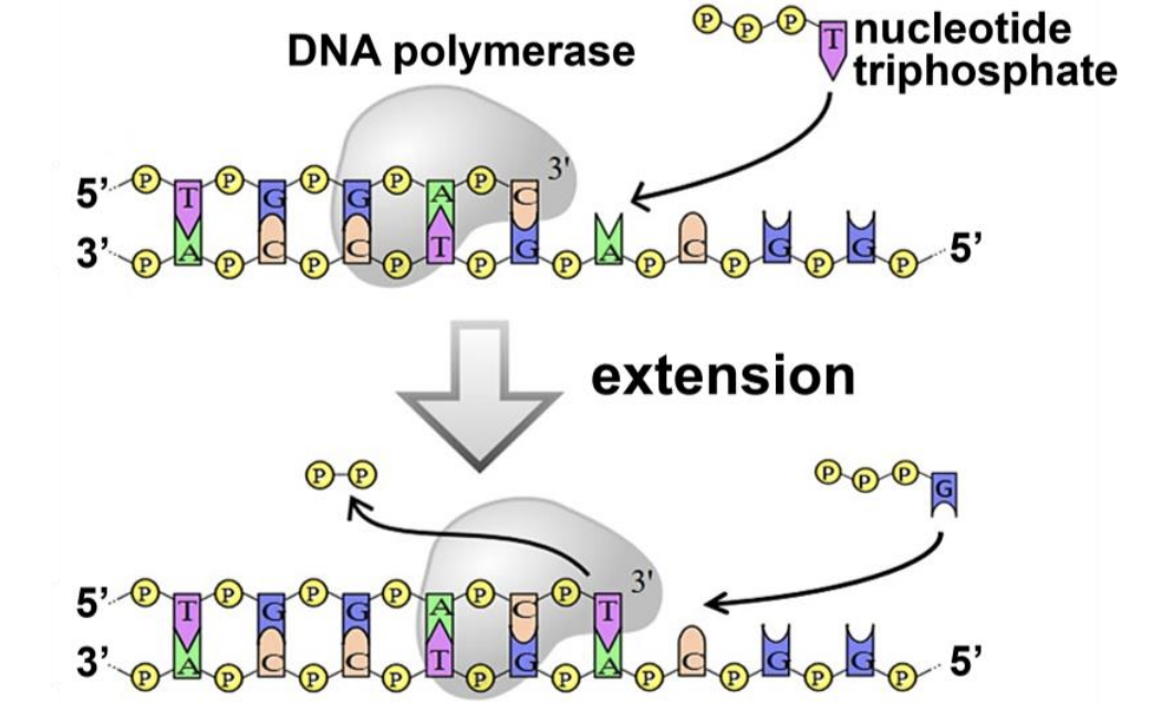 NĂ€r polymeraset fogar in nukleotiden i DNA-strĂ€ngen bildas en fosfodiesterbindning mellan 3âČ-OH-gruppen pĂ„ den vĂ€xande strĂ€ngen och 5âČ-fosfatgruppen pĂ„ dNTP:t.