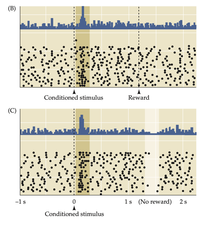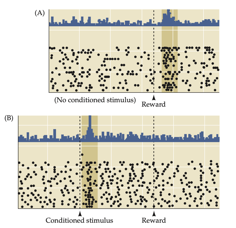 Belöning förutsĂ€gbar â dopamin-signal sker istĂ€llet nĂ€r signalen/cue presenteras, inte vid sjĂ€lva belöningen.